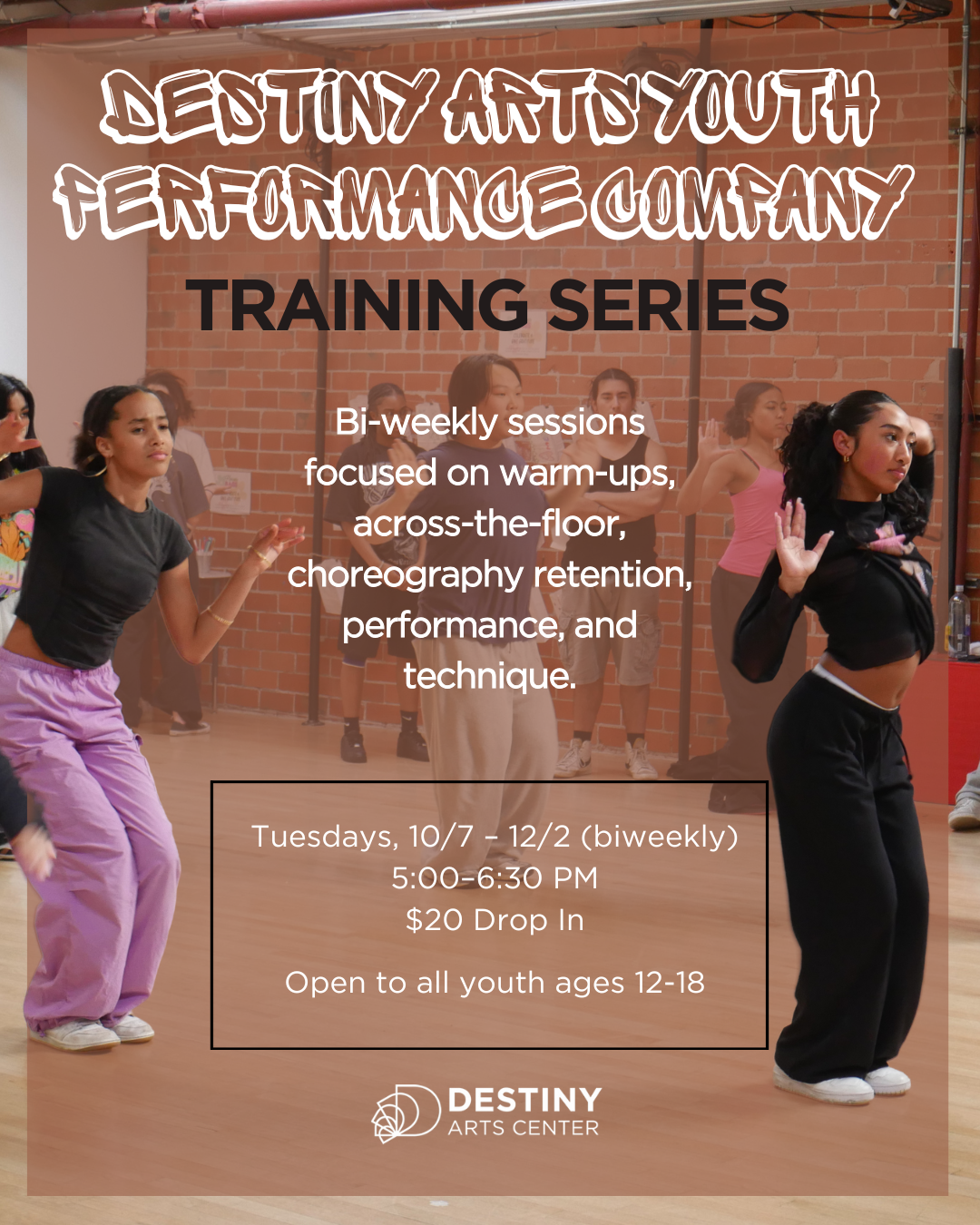 This fall, Destiny Arts Youth Performance Company is opening its doors! The DAYPC Training Series invites youth ages 12–18 to join Company for biweekly sessions focused on warm-ups, across-the-floor, choreography retention, performance, and technique. Led by Director Paula Dewart and rotating Dance Captains, this series offers a glimpse into the rigor and culture of Company while providing high-level training right here at Destiny.